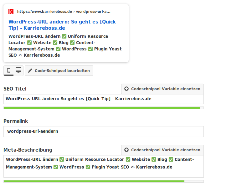 Nachdem du dieses installiert und aktiviert hast, kannst du unter jedem Blogartikel im Bearbeitungsmodus unter „Code-Schnipsel bearbeiten“, die WordPress-URL ändern.